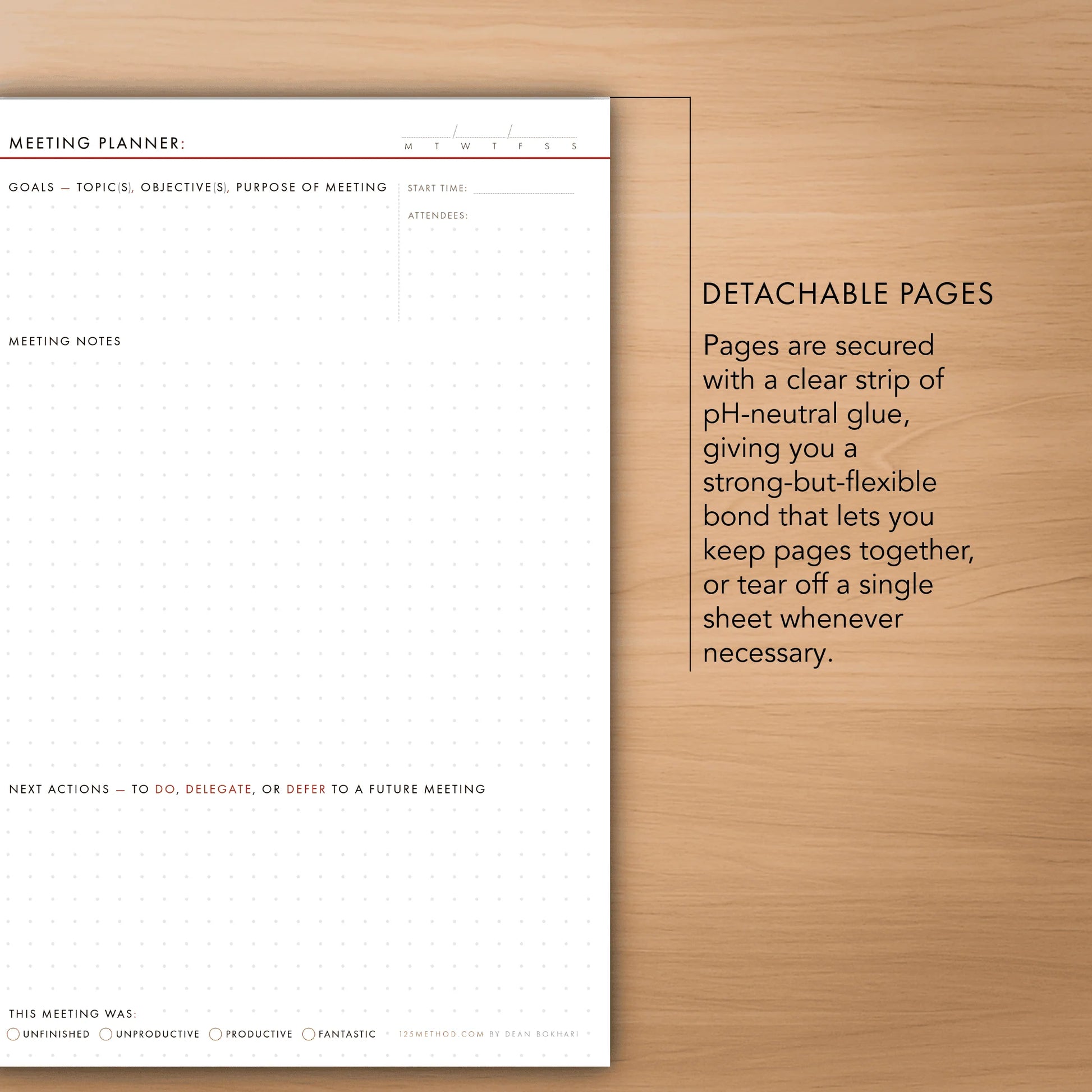 Spectacularly spacious and perfectly portable at 5.5″ × 8.5″, the Meeting Planner is compact enough to carry anywhere, yet spacious enough for clear thinking and effective note-taking at your desk.
