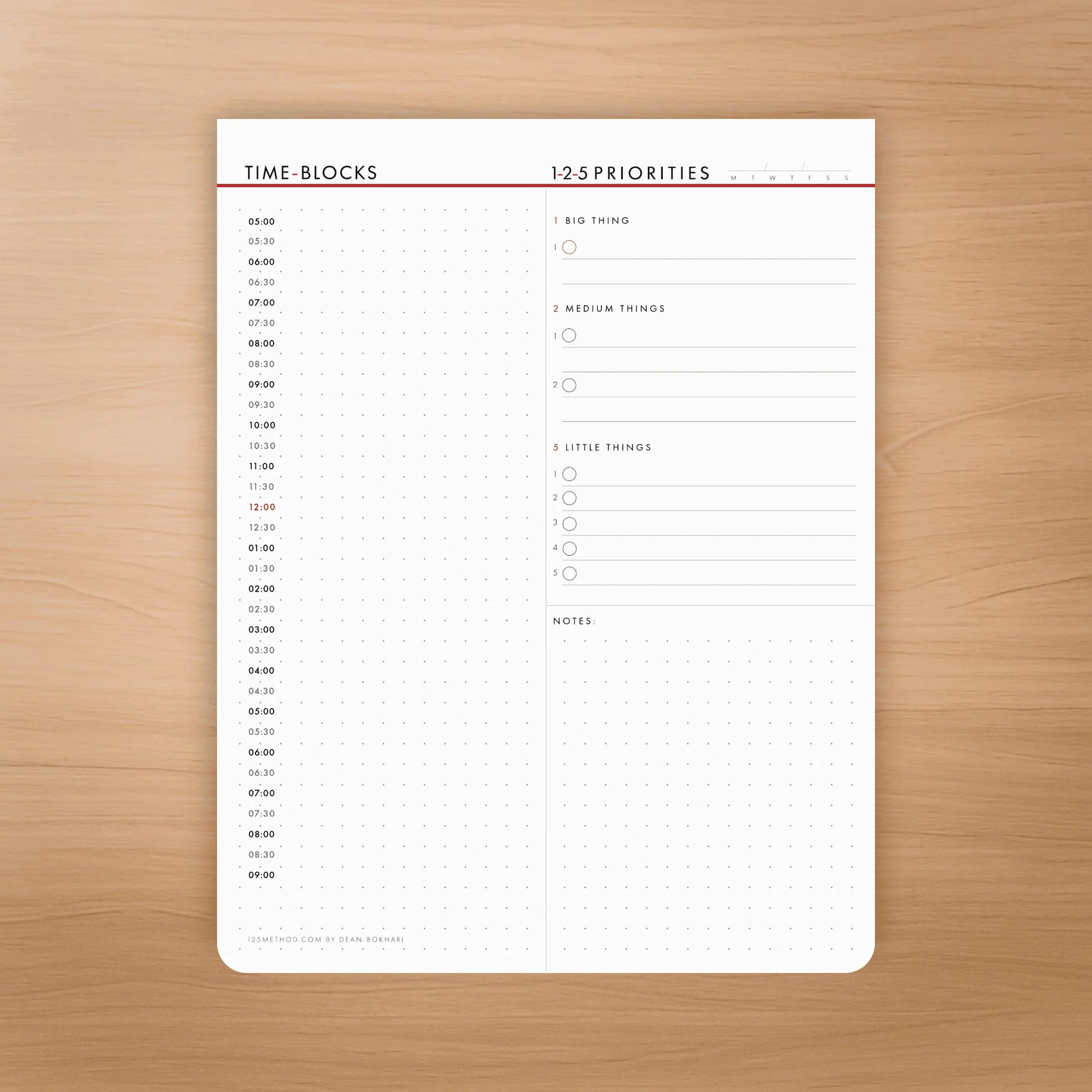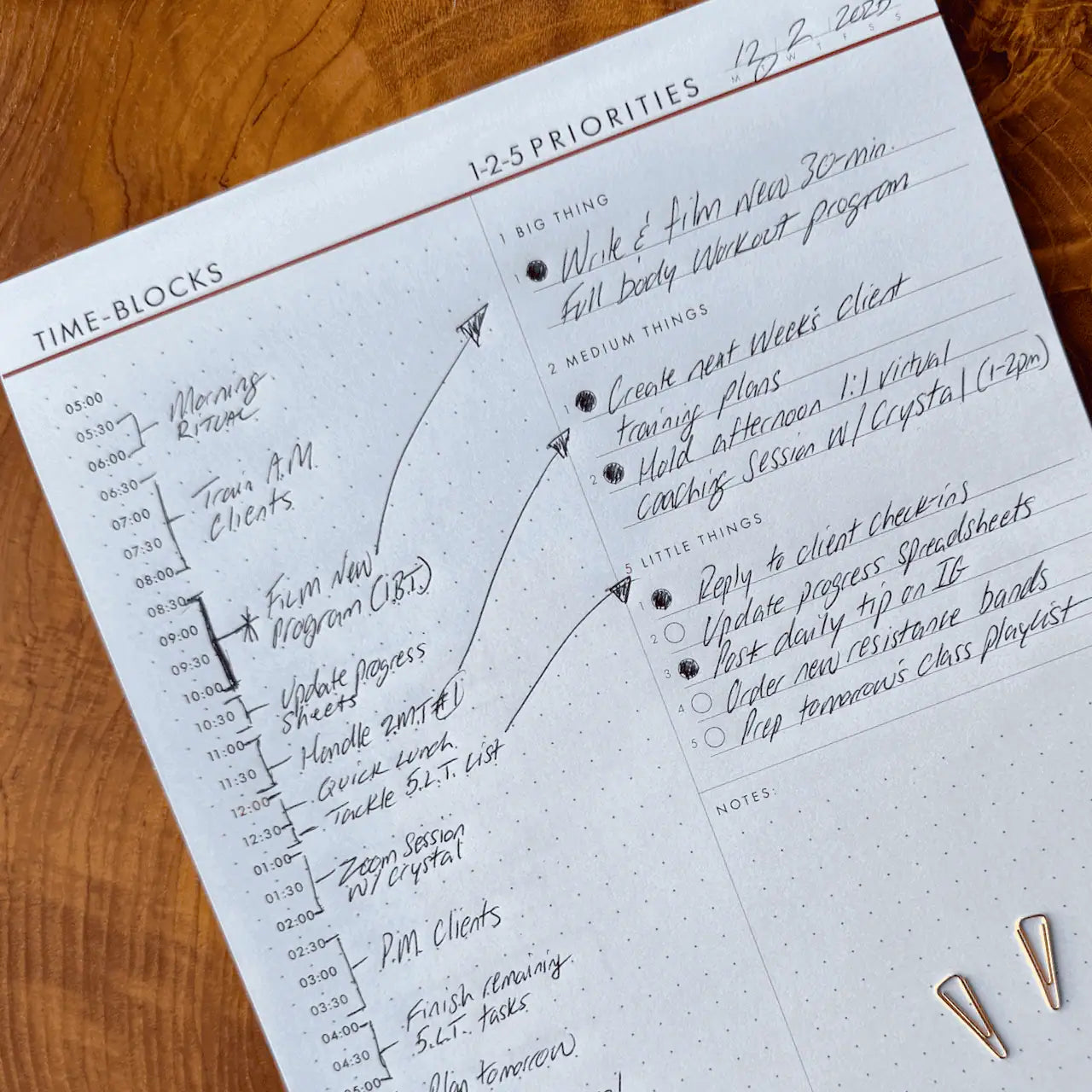 Most people wake up reactive. They jump into their day without a clear plan, or even a list of what needs to get done. They waste away their most productive hours by chasing distraction after distraction... And when the day is done, they find themselves wondering why nothing meaningful got done. I created The 1-2-5 Time Block Planner to combat this - so you can focus on getting things done without distraction. This beautiful, yet minimalist notepad helps you zoom in on your top priorities, block your time with intention, and end the day with a sense of control and accomplishment.