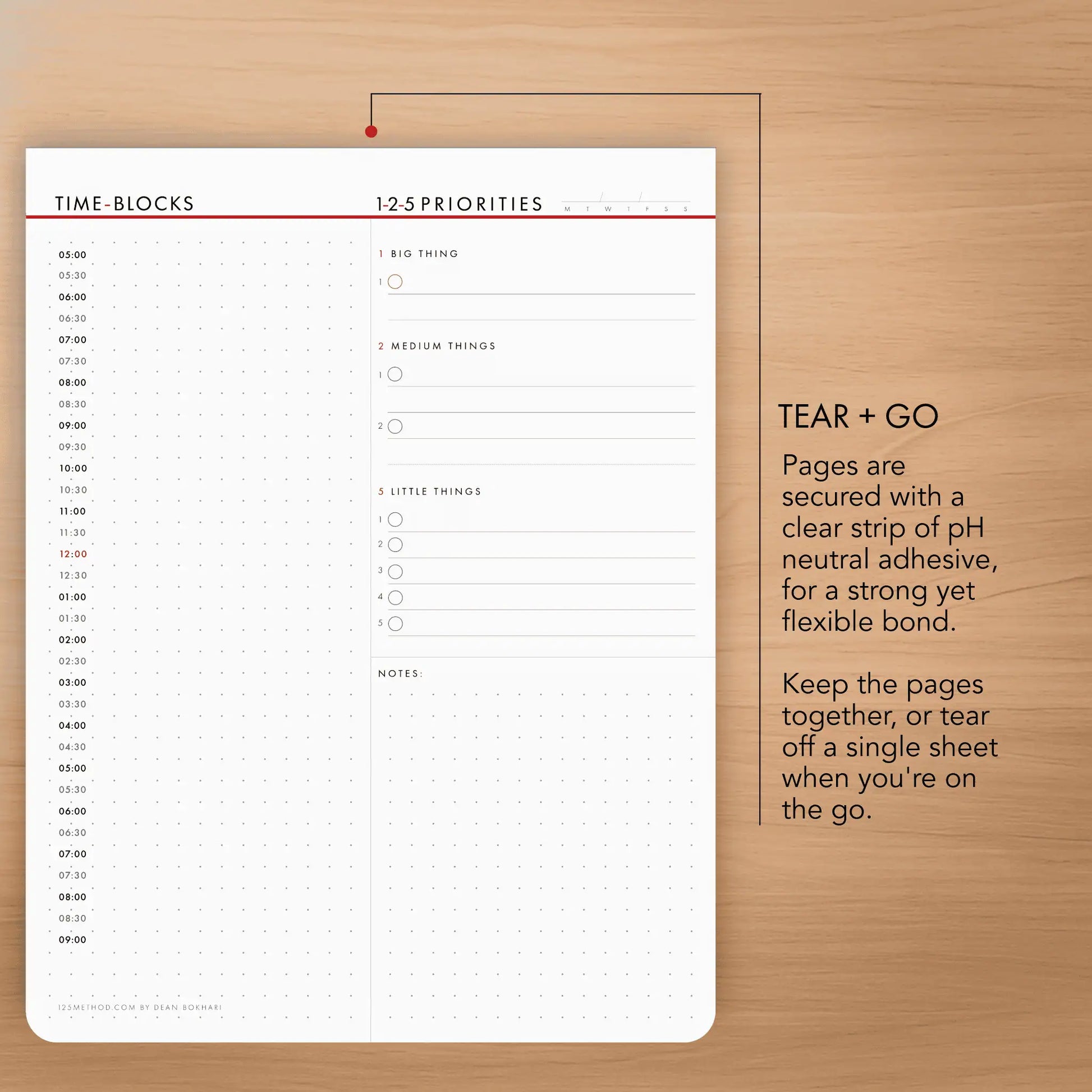 – Tear + go or stay in flow. Keep pages together by flipping them over each day, or cleanly tear pages off whenever necessary.