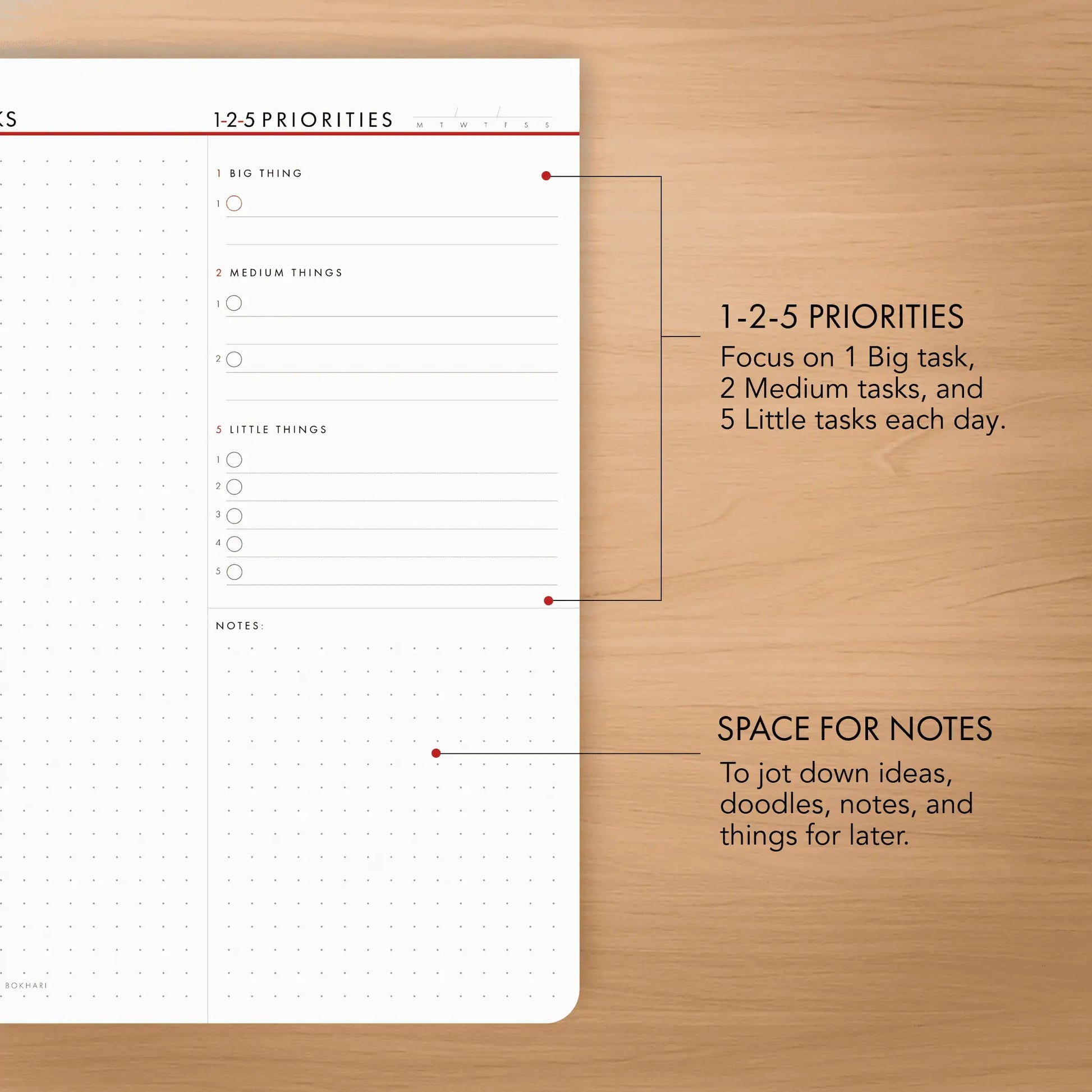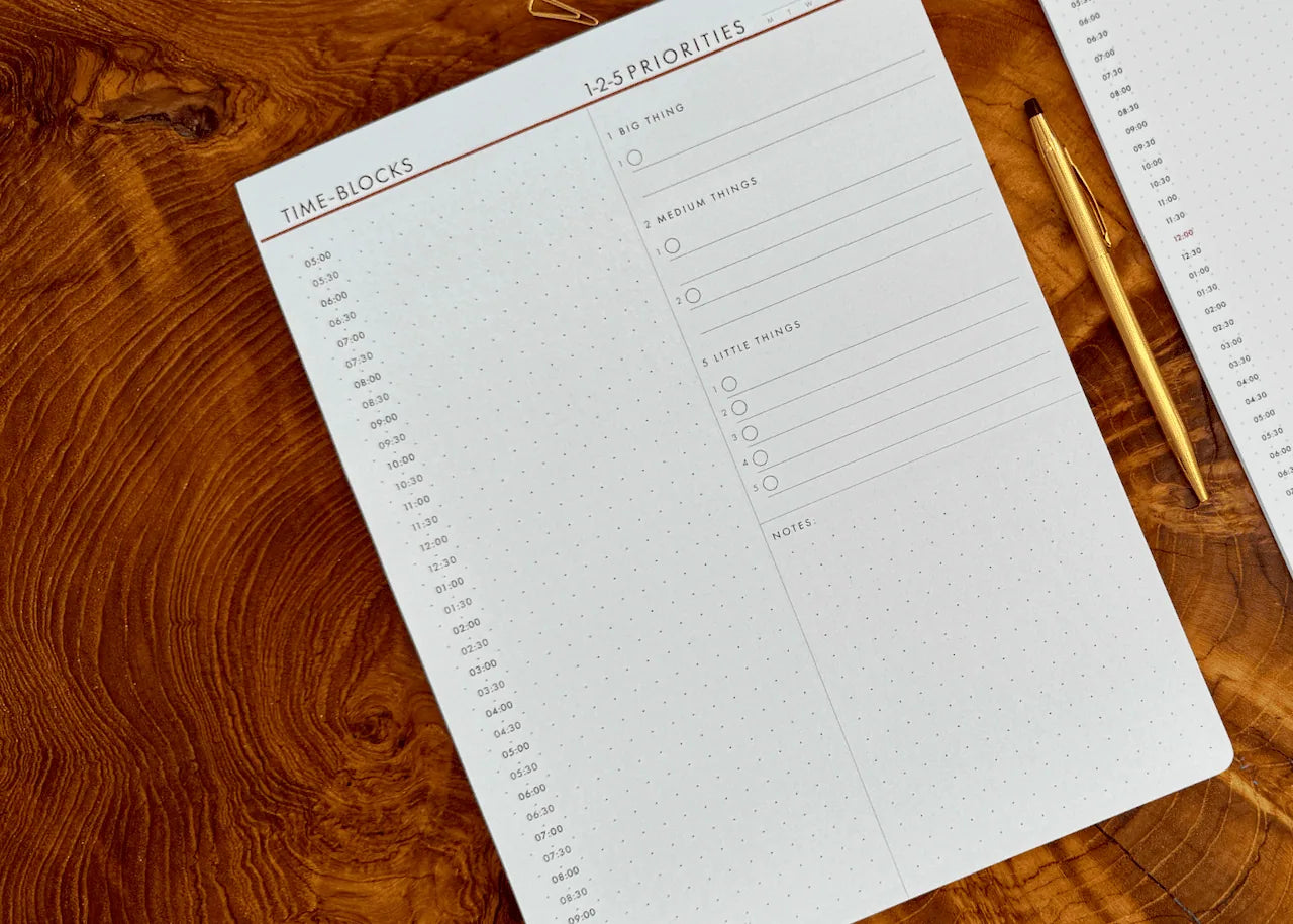 This beautiful, yet minimalist notepad helps you zoom in on your top priorities, block your time with intention, and end the day with a sense of control and accomplishment.