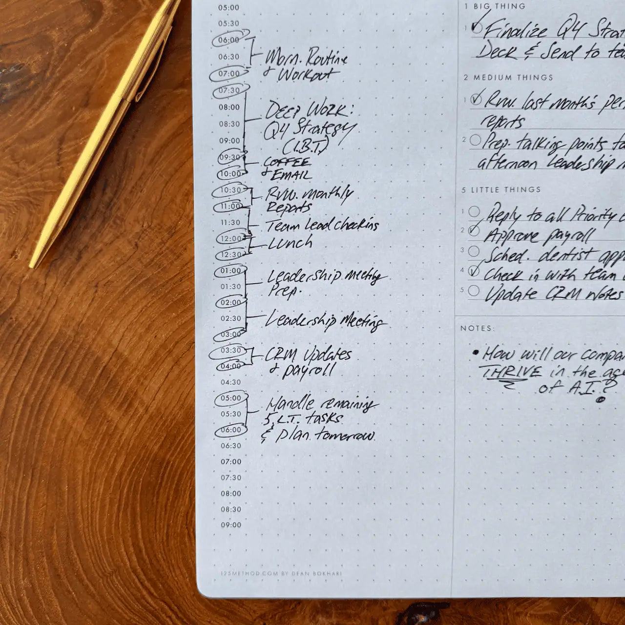 – The 1 -2 -5 Method™. Prioritize 1 Big Thing, 2 Medium Things, and 5 Little Things daily to stay laser-focused.