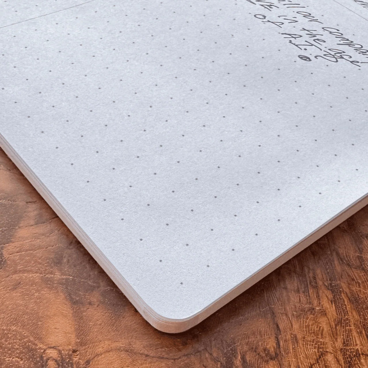 We use 24# premium white paper (90 GSM) — thicker and smoother than regular notepads. It holds ink well with minimal bleed-through, so you can use your favorite pens.