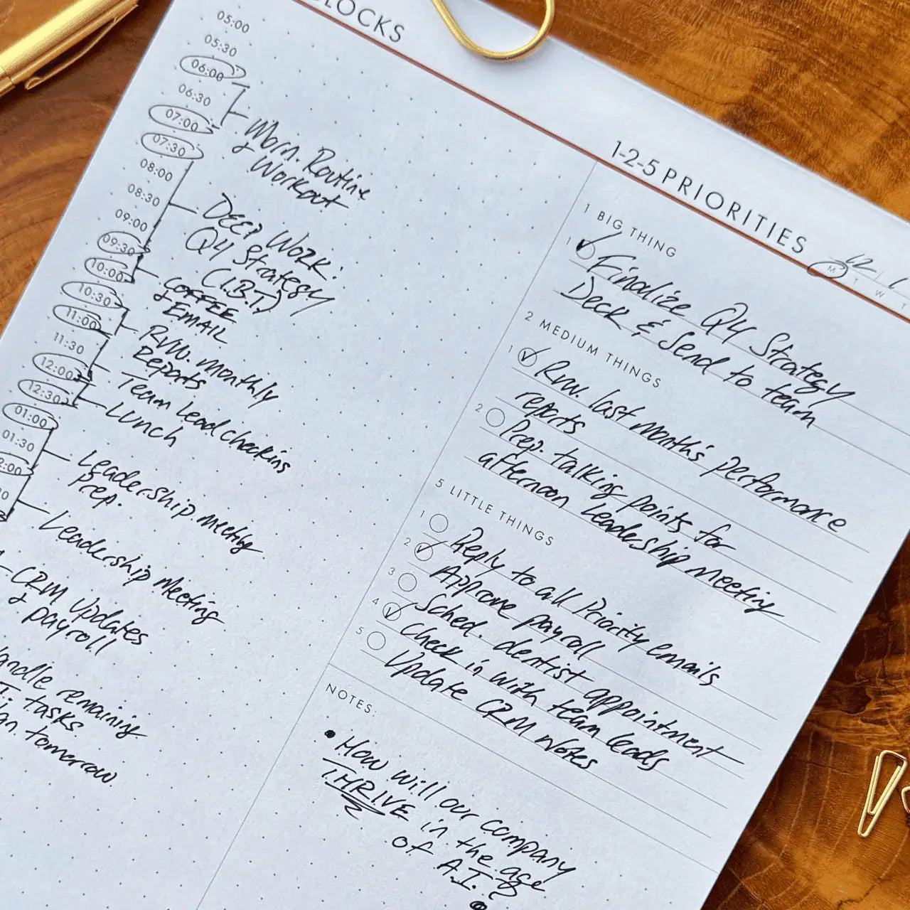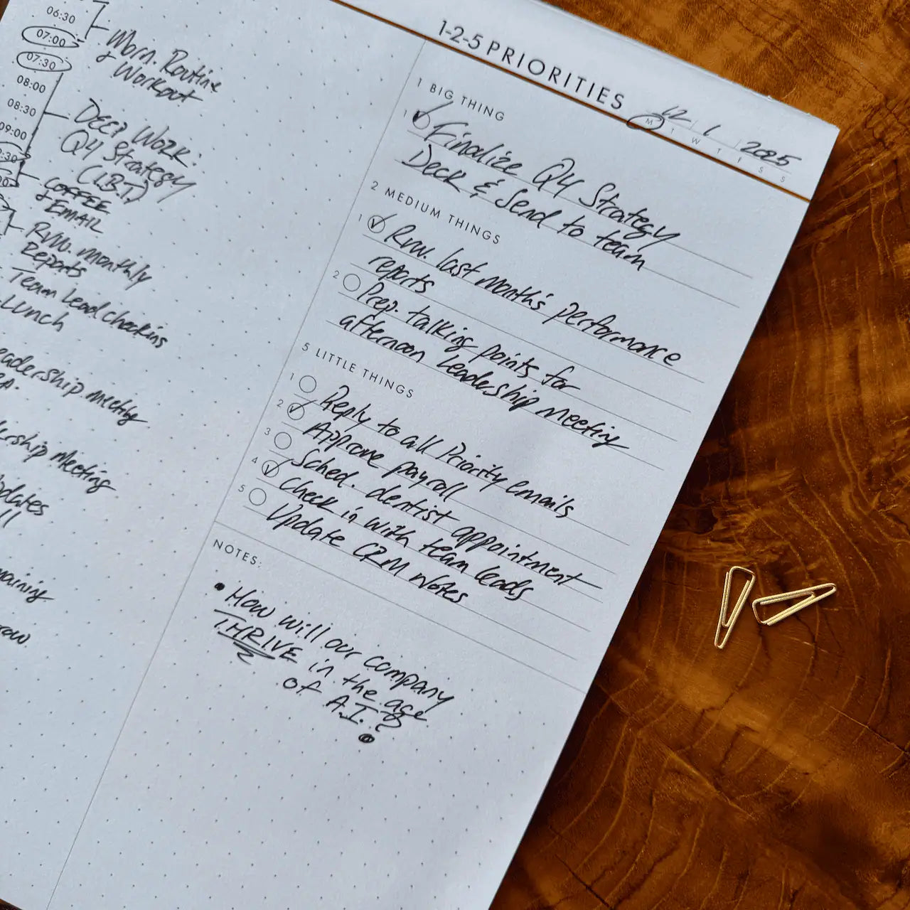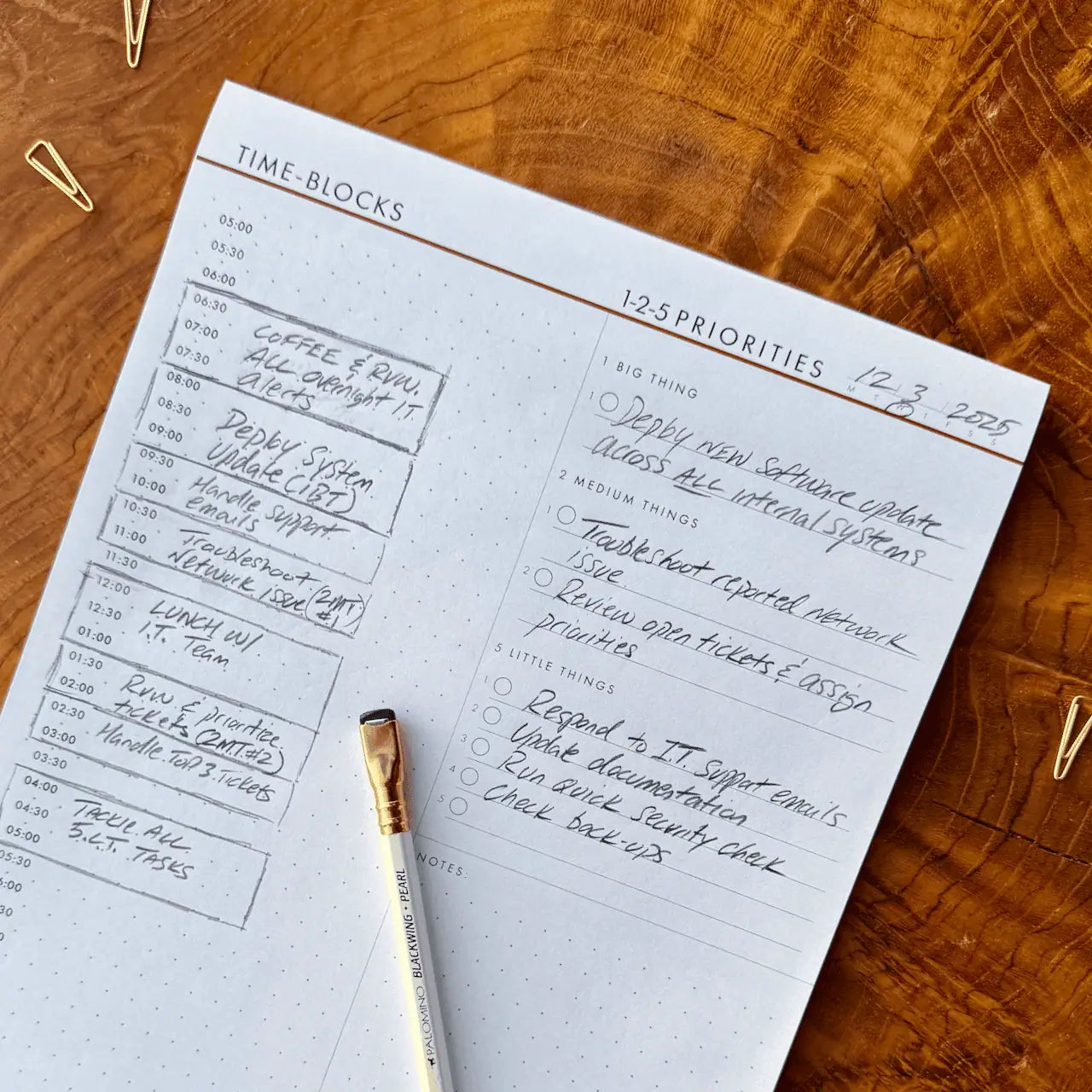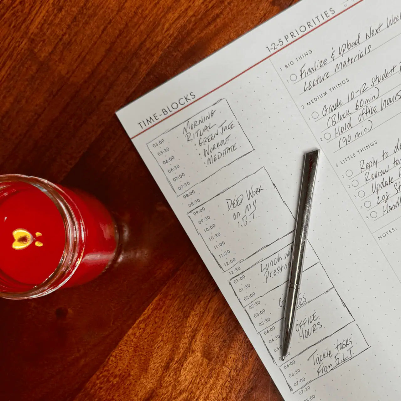 Whether you’re managing client work, leading a company, maintaining a household, studying for finals, running a business, or just want more structure in your day, this daily planning pad adapts to your life.