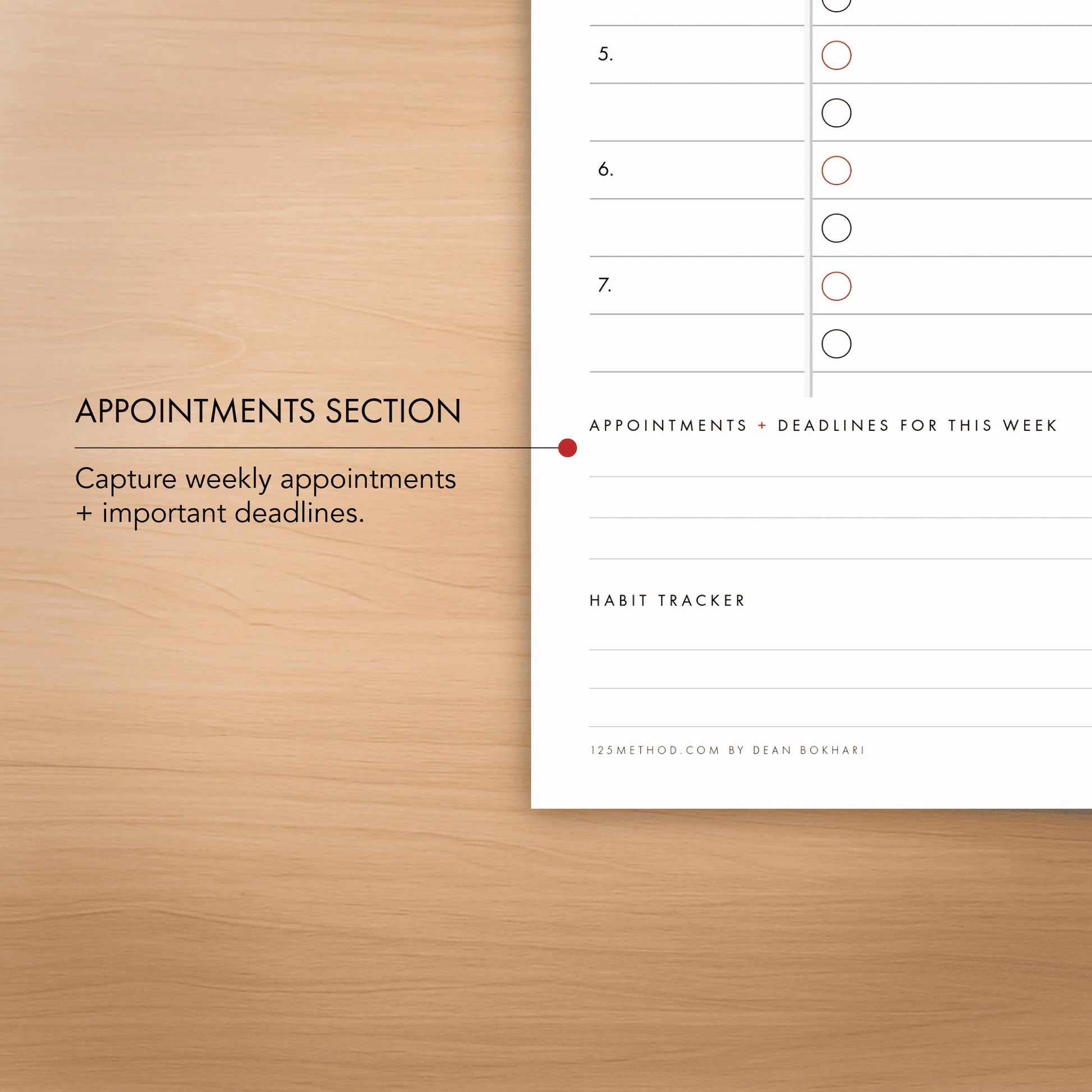 Use the Appointments + Deadlines section to jot down any important events, meetings, or due dates you've got going on this week.